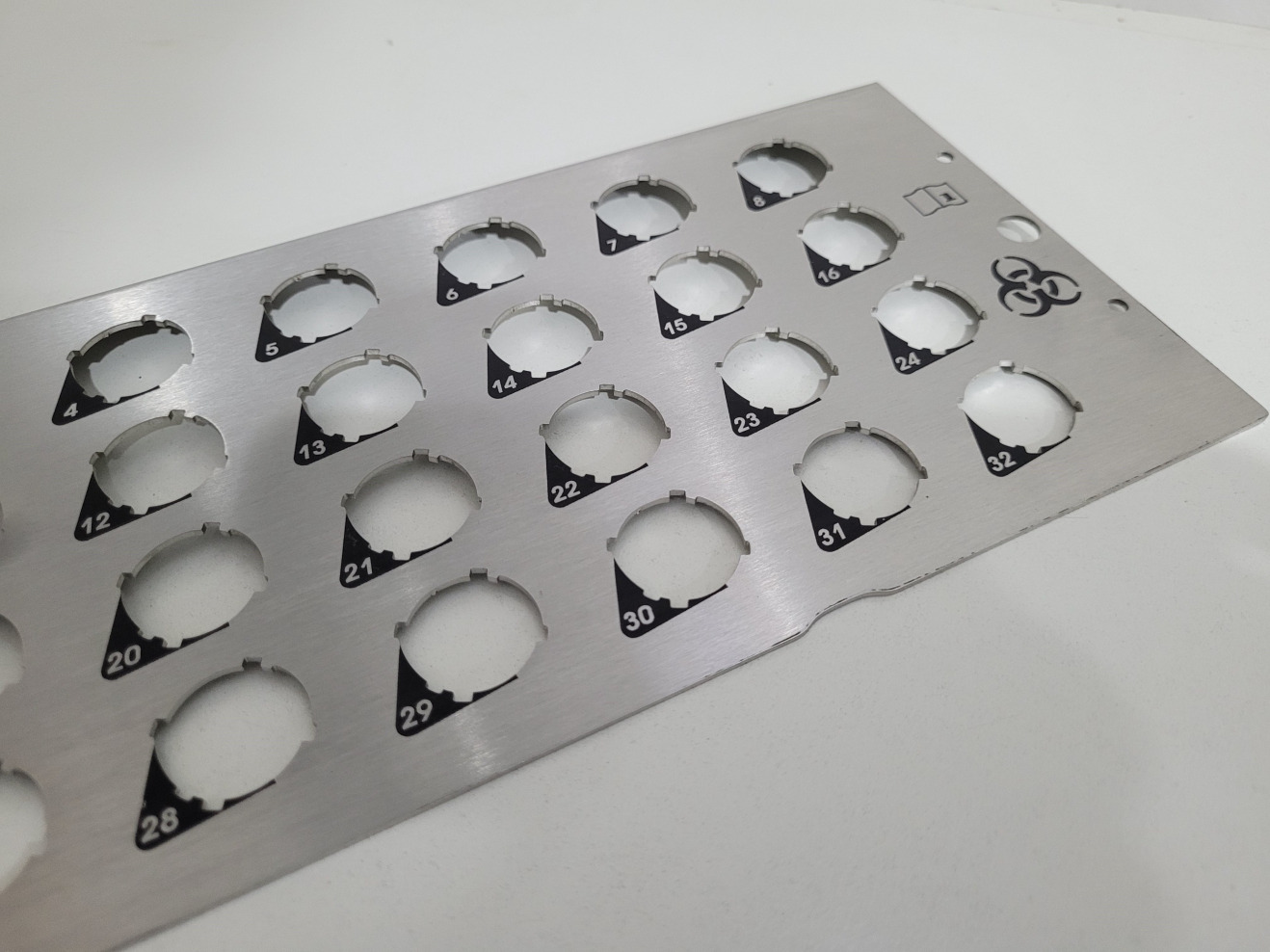 Placa con numeración y código de barras en aluminio anodizado negro.